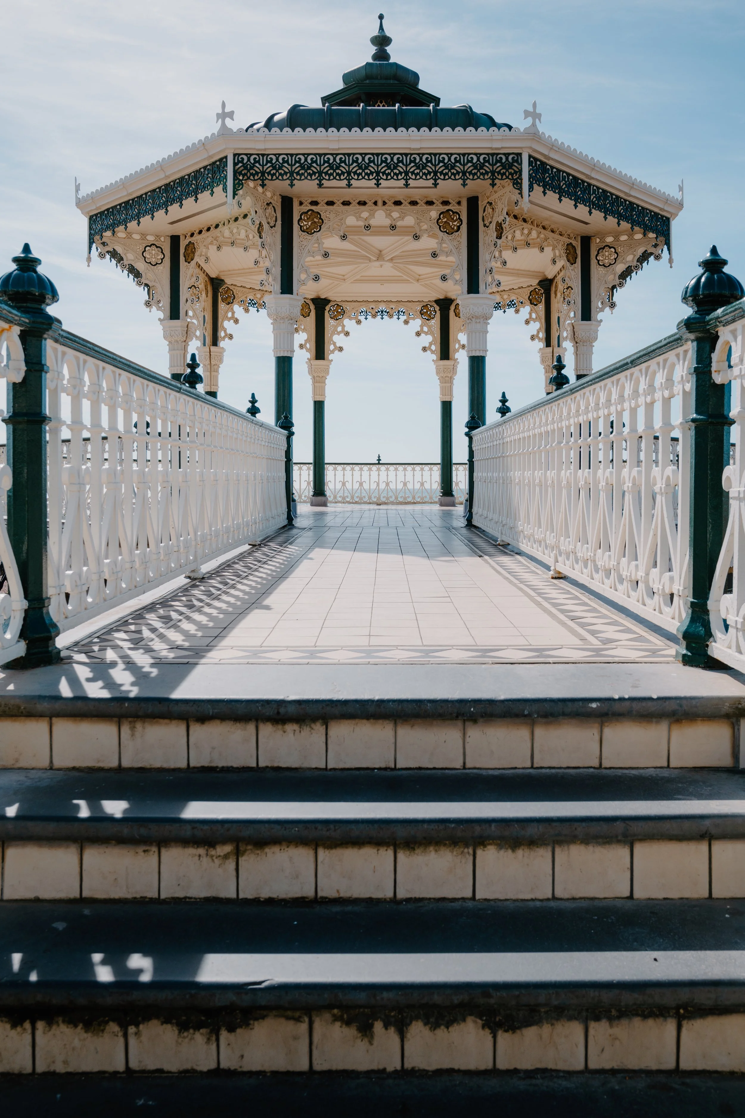 White chalk cliffs with grassy top, two people walking near the edge, lighthouse near the water in the background